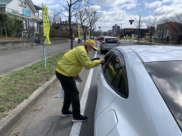 御所野町内から15名、秋田銀行職員2名、交通安全協会1名および御所野交番・東警察署3名の総勢21名でドライバーへ安全運転を呼びかけました。